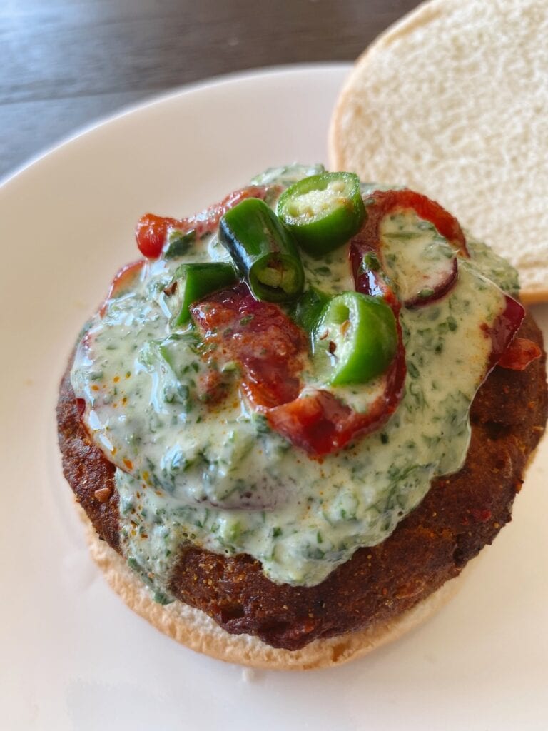 If you grew up eating aloo tikki from street carts, this aloo tikki burger will hit you right in the nostalgia… but with an upgrade. Imagine crispy golden potato patties stuffed with melted paneer and cheese, then drenched in cilantro chutney, tangy pickled onions, sweet-spicy tamarind chutney, and vinegary green chilies. So good!